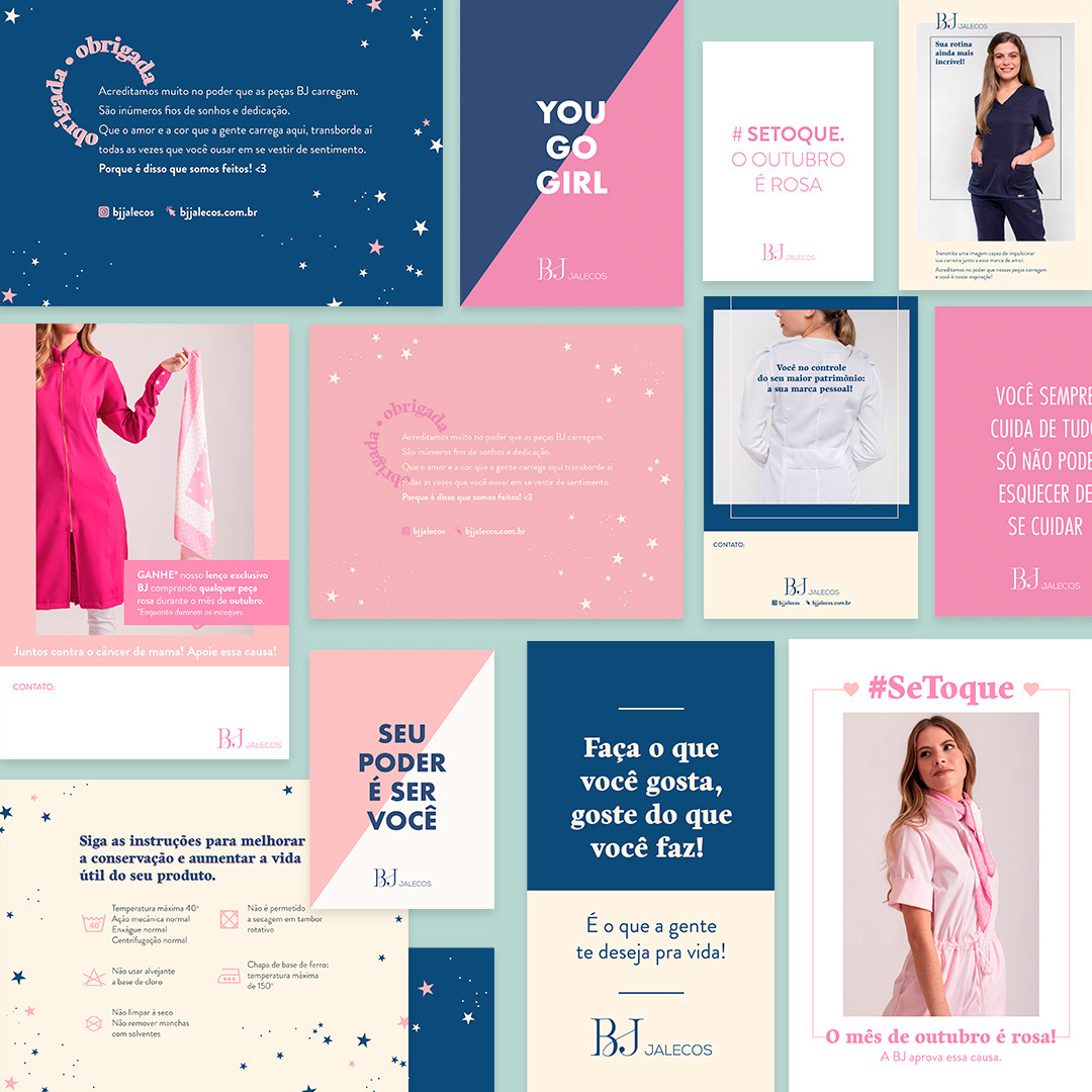 A BJ Jalecos é uma marca brasileira de jalecos e pijamas cirúrgicos que combina estilo e funcionalidade. Com uma identidade jovem e descontraída, suas peças são pensadas para a mulher moderna, que busca conforto no dia a dia sem abrir mão da personalidade, mesmo no ambiente de trabalho. Para a marca, desenvolvi embalagens especiais para os jalecos, além de diversas peças gráficas, brindes e a embalagem padrão para envio, garantindo uma experiência de marca completa e alinhada à sua proposta.