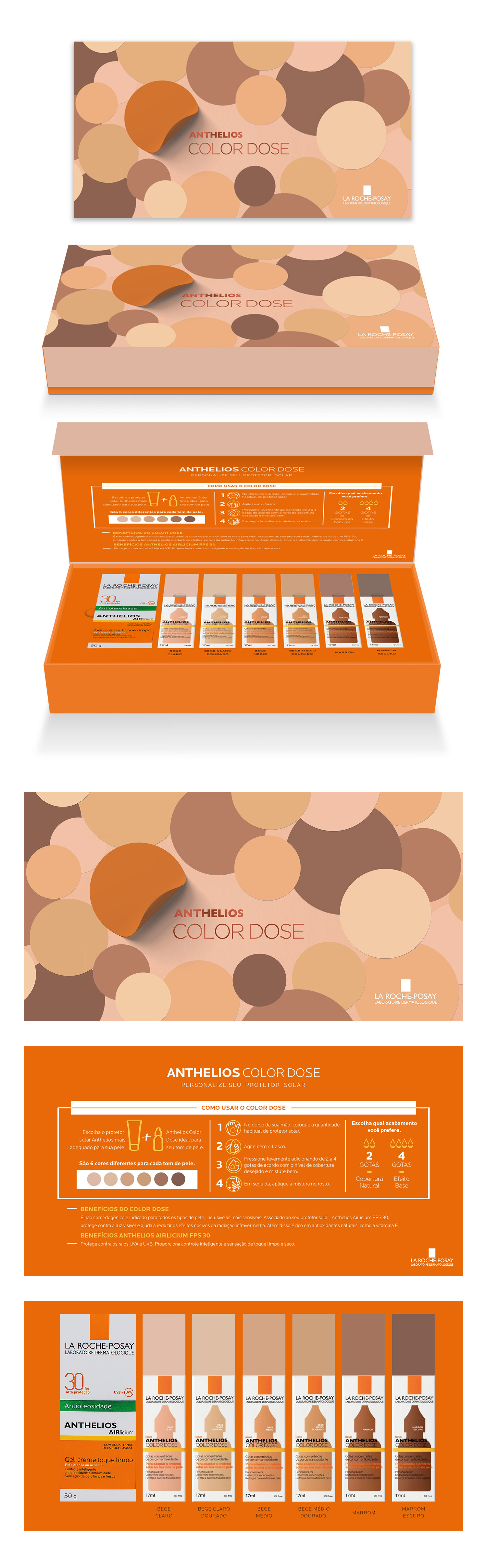 Press kit desenvolvido para o lançamento do Anthelios Color Dose, da La Roche-Posay. O produto foi criado para adaptar o protetor solar à tonalidade da base com apenas algumas gotas. Sua principal característica é a adaptabilidade de cor, transformando qualquer protetor solar em um produto com tons semelhantes aos de uma base. Para destacar essa versatilidade, utilizamos círculos representando as tonalidades disponíveis, com um deles destacando a cor da marca. Dentro da caixa, incluímos informações detalhadas sobre o uso correto do produto e os benefícios tanto do Color Dose quanto do protetor solar complementar. Aproximadamente 500 unidades da caixa foram produzidas e distribuídas para influenciadores de beleza e maquiagem.