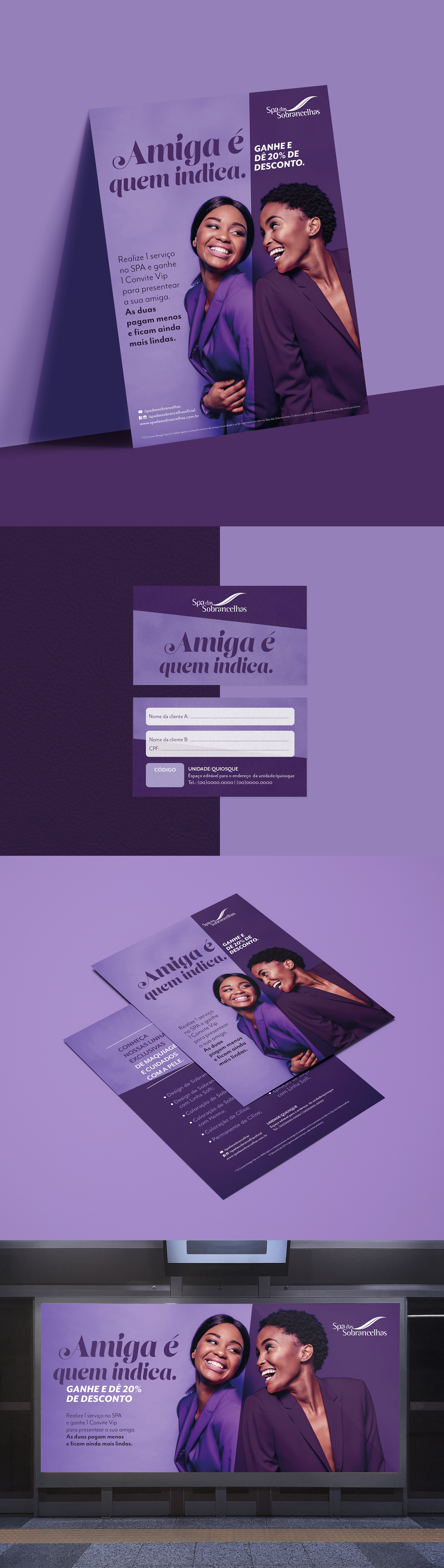Promotional campaign designed to showcase the “A Friend Who Recommends” program by the Spa das Sobrancelhas salon network. Since the brand’s visual identity is centered on the color purple, we carefully edited the two photos used to ensure they complemented each other and aligned seamlessly with the environment, enhancing the campaign’s visual consistency.
