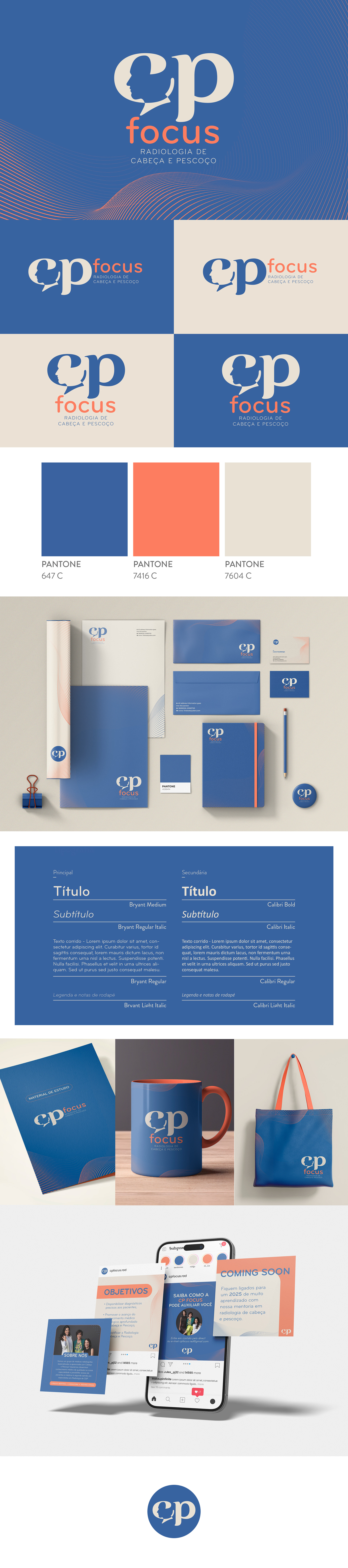 O projeto da identidade visual para a CP Focus foi desenvolvido para refletir a precisão e a expertise da marca no campo da radiologia de cabeça e pescoço. O design explora a revelação da silhueta contida na letra "C" por meio do contraste entre as cores, criando uma referência direta à radiologia e incorporando à marca um símbolo da especialização. A tipografia transmite profissionalismo e clareza, enquanto a paleta de cores reforça a sensação de acolhimento e a confiabilidade essenciais para o público médico.