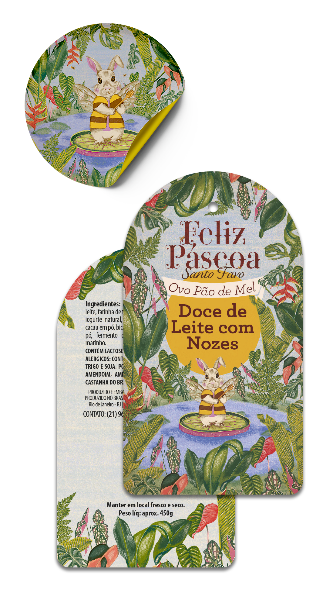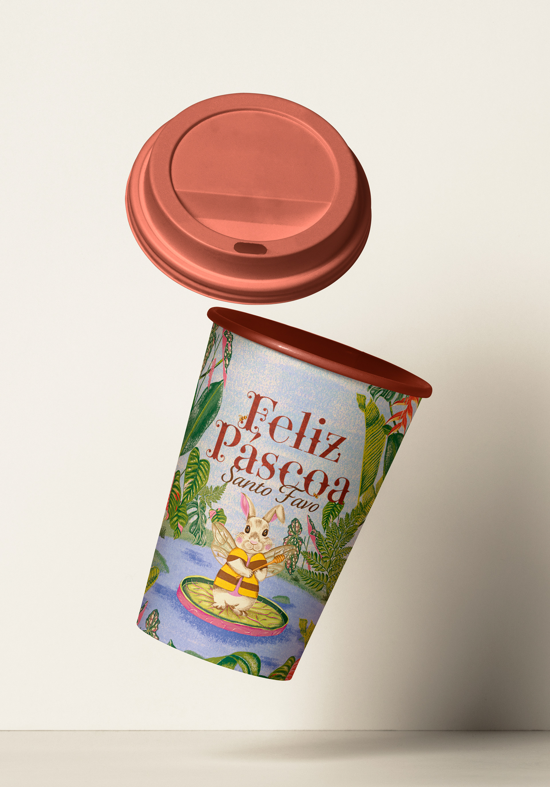 The inspiration for Santo Favo's 2025 Easter campaign came from classic vintage children's books, infused with a tropical flair that captures the brand's Rio de Janeiro essence. We created an enchanted Atlantic Forest where a little rabbit tries to disguise itself as a bee. The creative approach treated the entire project like an illustrated book cover—each element was digitally hand-drawn, and only after this "cover" was complete did it expand into packaging, promotional materials, and communication pieces.