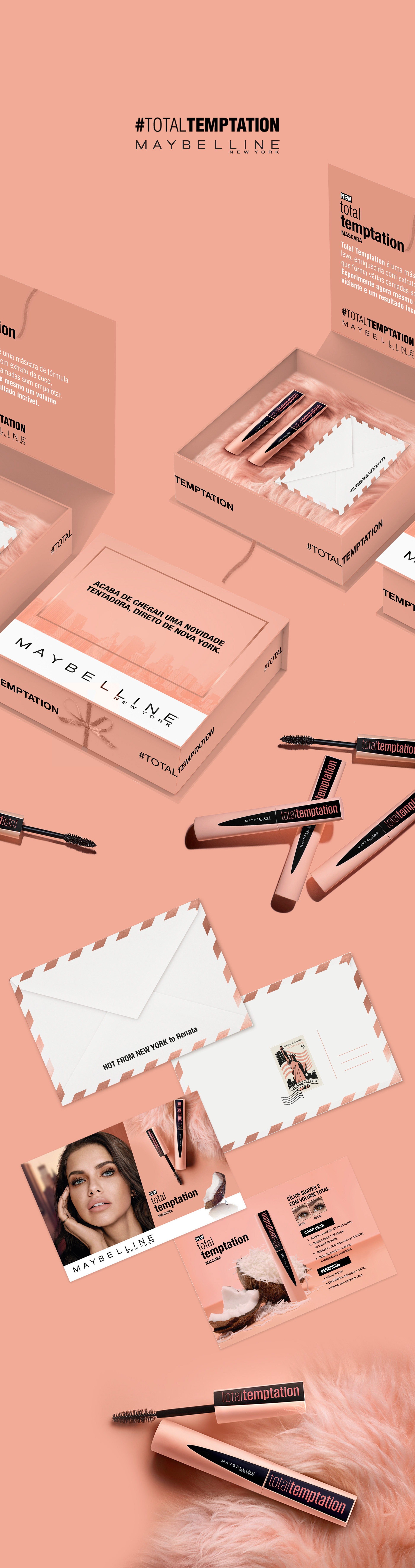 In this project, I developed the press kit and promotional materials for the launch of Maybelline's Total Temptation mascara, a L'Oréal brand. The aesthetic followed the same pink tone as the packaging, combined with the New York skyline—a signature element of the brand's visual identity. The details were designed to convey delicacy and sophistication. The bottom of the box was lined with pink plush fabric, while a ribbon bow secured the closure. Additionally, the kit included a flyer with usage instructions, designed in the style of a postcard.